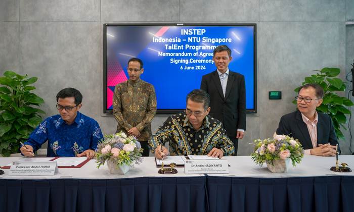 Direktur Jenderal Pendidikan Tinggi, Riset, dan Teknologi Kemendikbudristek, Abdul Haris; Direktur Utama LPDP, Andin Hadiyanto; dan Presiden atau Rektor NTU, Profesor Ho Teck Hua, menandai peluncuran program beasiswa INSTEP dalam sebuah acara yang diadakan di NTU pada Kamis lalu.
