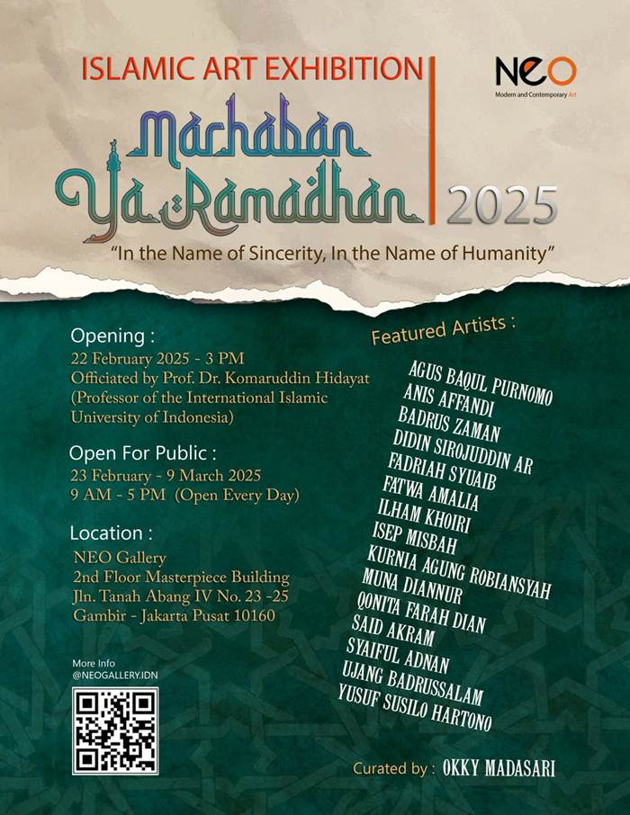 JAKARTA – Pameran Seni Rupa Islami (lukisan kaligrafi) di Indonesia memasuki babak baru. Hal itu dikarenakan pada pameran “Marhaban Ya Ramadhan” yang akan digelar di Galeri Neo, Jakarta, 22 Februari – 9 Maret 2025 itu, dikuratori oleh perempuan. Bahkan, empat dari 15 pesertanya juga perempuan yang berasal dari berbagai kota di tanah air.
