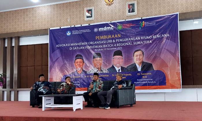SUNGAI PENUH – Dua orang guru Muhammadiyah dari Kota Sungai Penuh mendapat kesempatan mengikuti Pelatihan Advokasi Manajemen Organisasi LRB dan Pengurangan Risiko Bencana (PRB) di Satuan Pendidikan Batch 4 Regional Sumatera. Kegiata tersebut berlangsung selama tiga hari pada 21–23 November 2025 di Hotel Mercure Bengkulu.