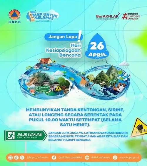 Hari ini, 26 April 2026, adalah Hari Kesiapsiagaan Bencana (HKB) yang ditetapkan pemerintah. Mengusung tema Siap untuk Selamat; Bersatu dalam Siaga, Tangguh Menghadapi Bencana, ditujukan untuk membangun kebersamaan di tengah masyarakat negeri ini dalam membudayakan sadar bencana.
